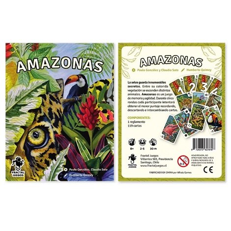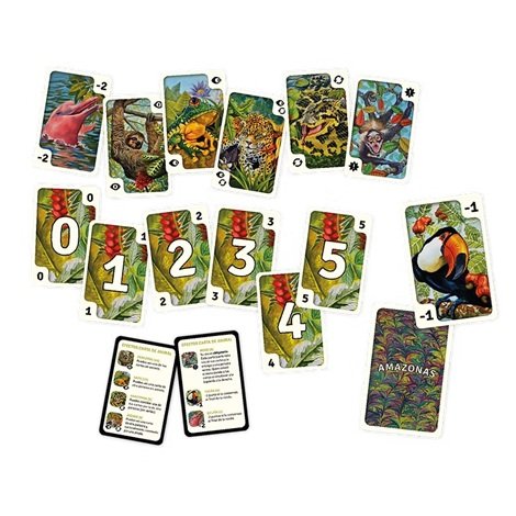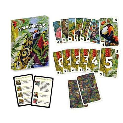 La selva guarda innumerables secretos. Entre su colorida vegetación se esconden distintos animales. Amazonas es un juego de memoria y agilidad. Durante cinco rondas cada participante intentará obtener el menor puntaje recordando, descartando e intercambiando cartas.